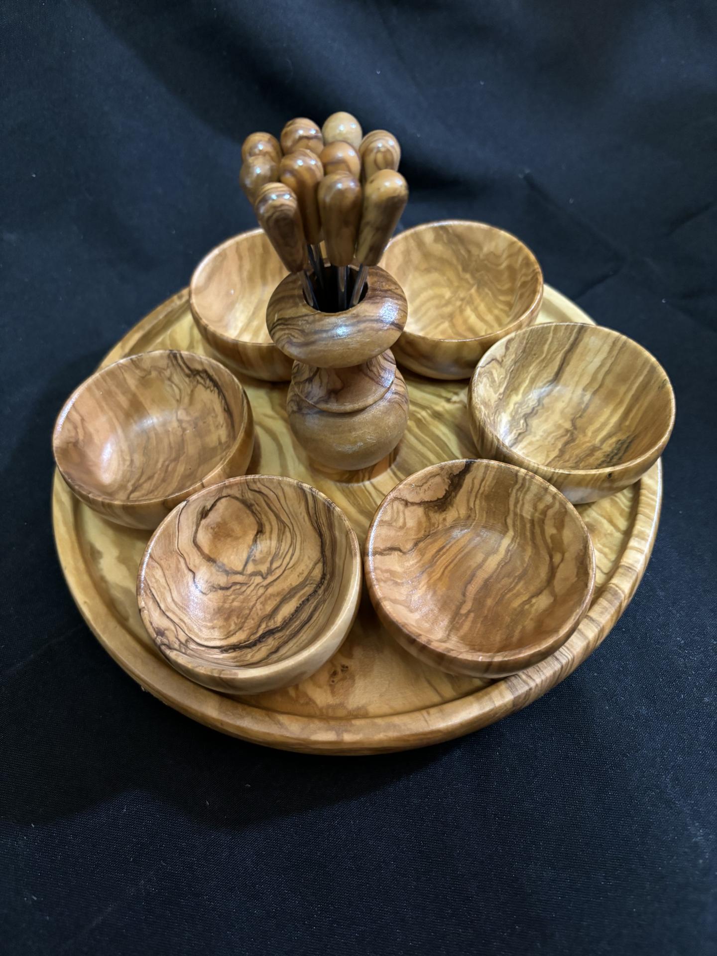 Bandeja de Aperitivos Vintage con 6 Mini Cuencos y 10 Pinchos – Artesanía en Madera de Olivo Hecha en España